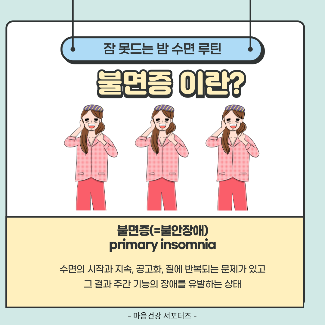 불면증은 수면의 시작과 지속 등 반복되는 문제가 있어 잠에 들지 못하게 되는 상태입니다.