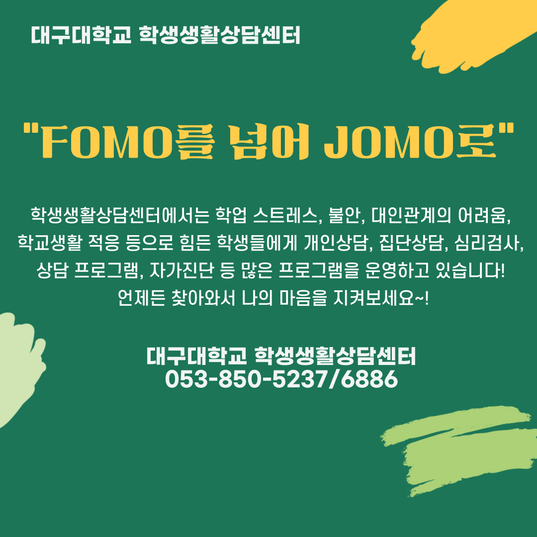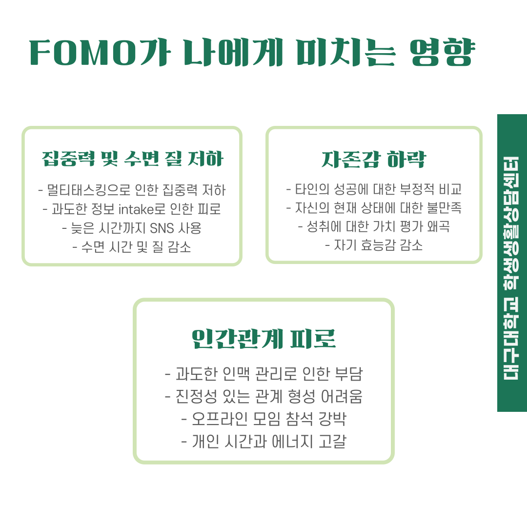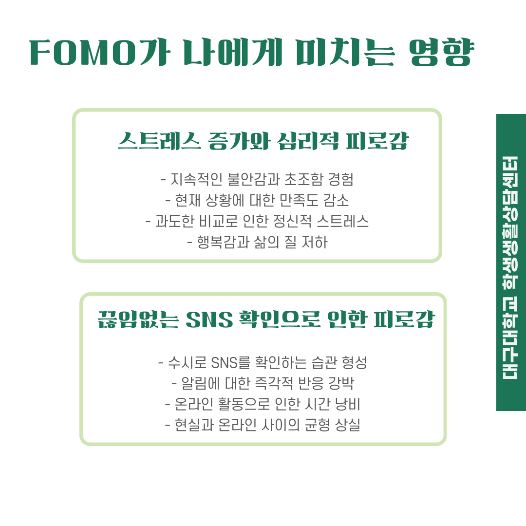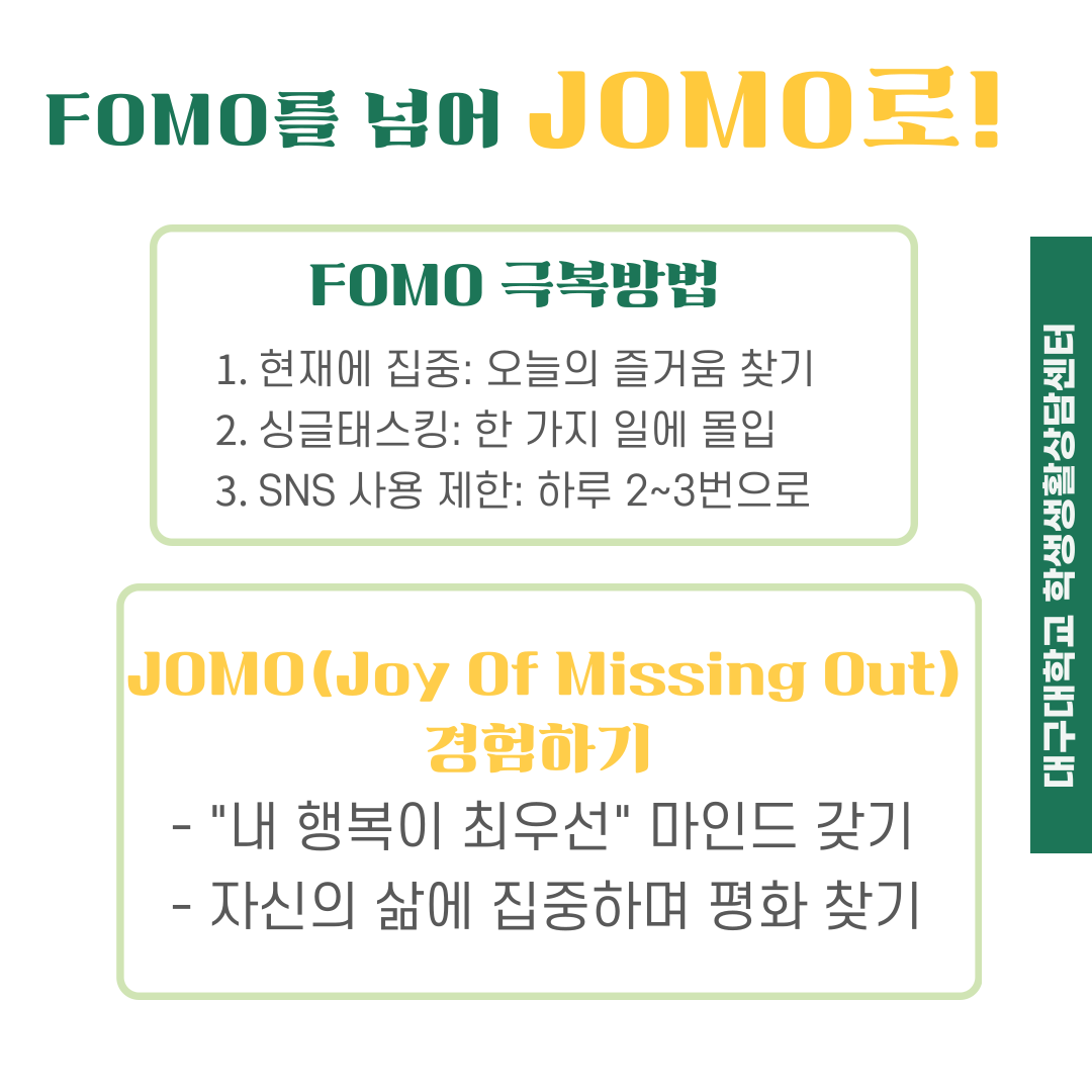 이번 카드뉴스에서는 이러한 마음의 원인인 **"포모(FOMO) 증후군"**에 대해 알아보았습니다.